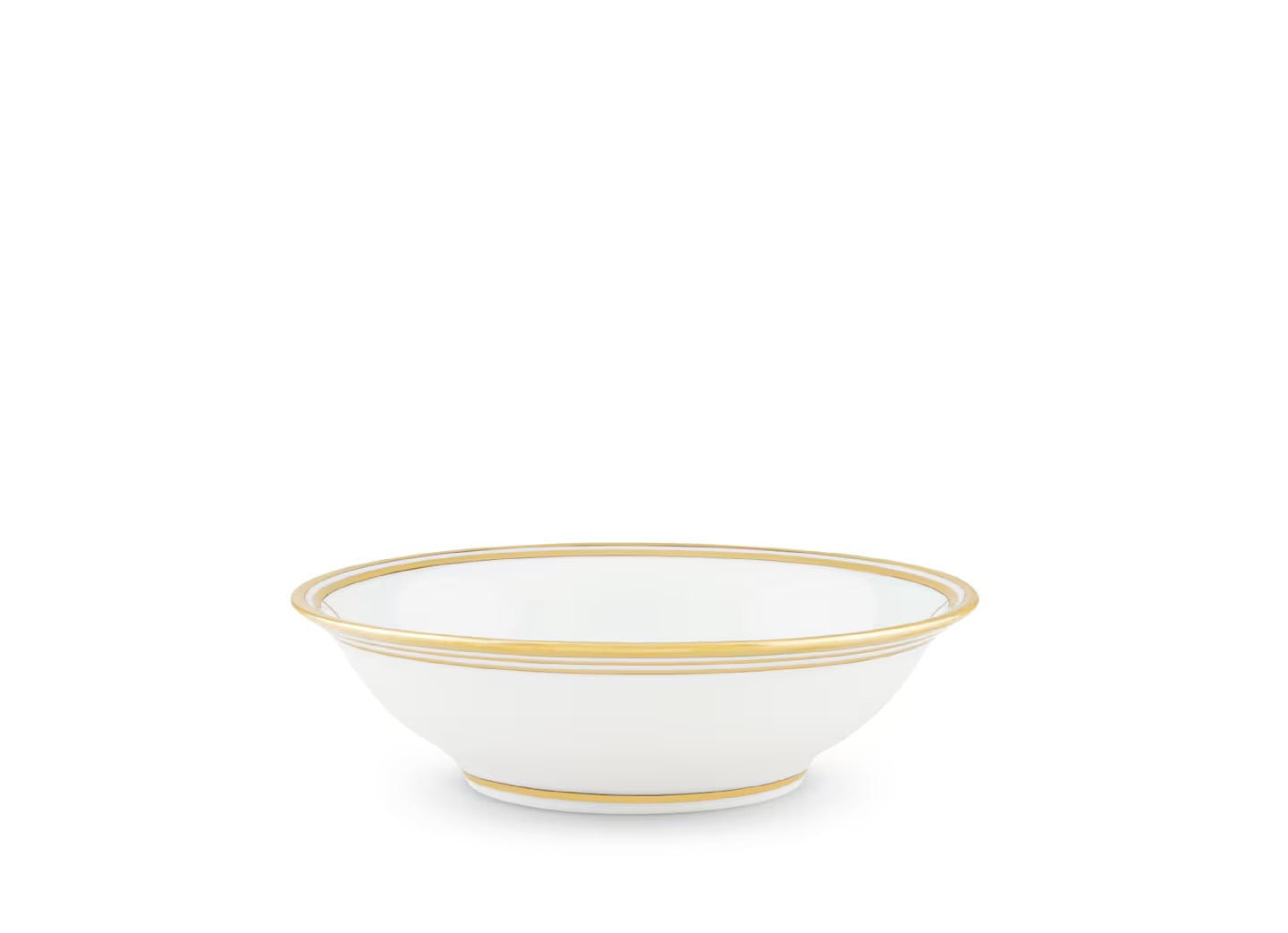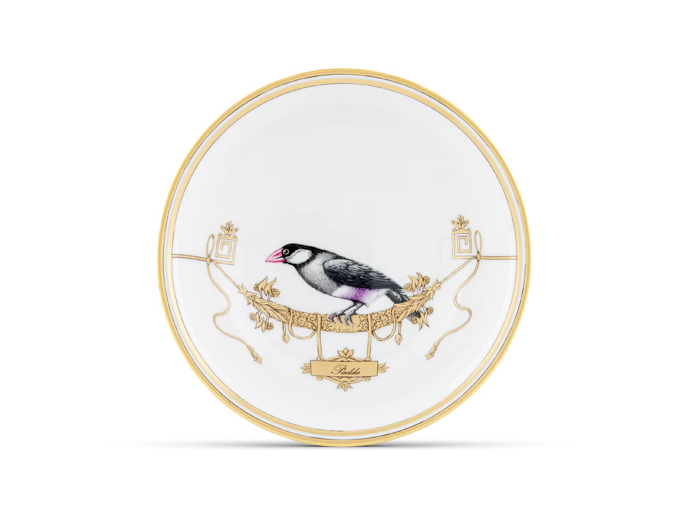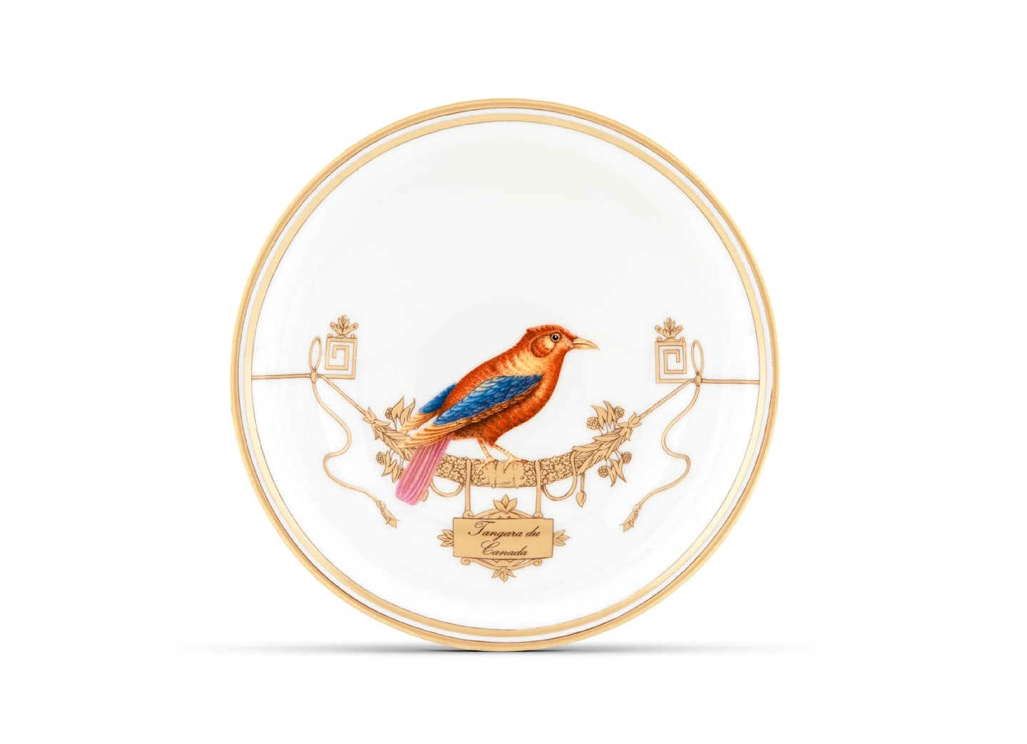 A precious hand-painted pure gold decoration frames a Tangara du Canada, with warm and lively tones that stand out against the fine white Italian porcelain. The bread plate, defined by its historical Impero shape, is designed in combination with the table proposal of the same collection, or as a unique and sophisticated standout element in refined mise en place. The Volière Collection depicts several graphic subjects in overglaze that take inspiration from ancient botanical publications. The decorations are made with over fifty shades of colours and make each element a precious collector's item of art.