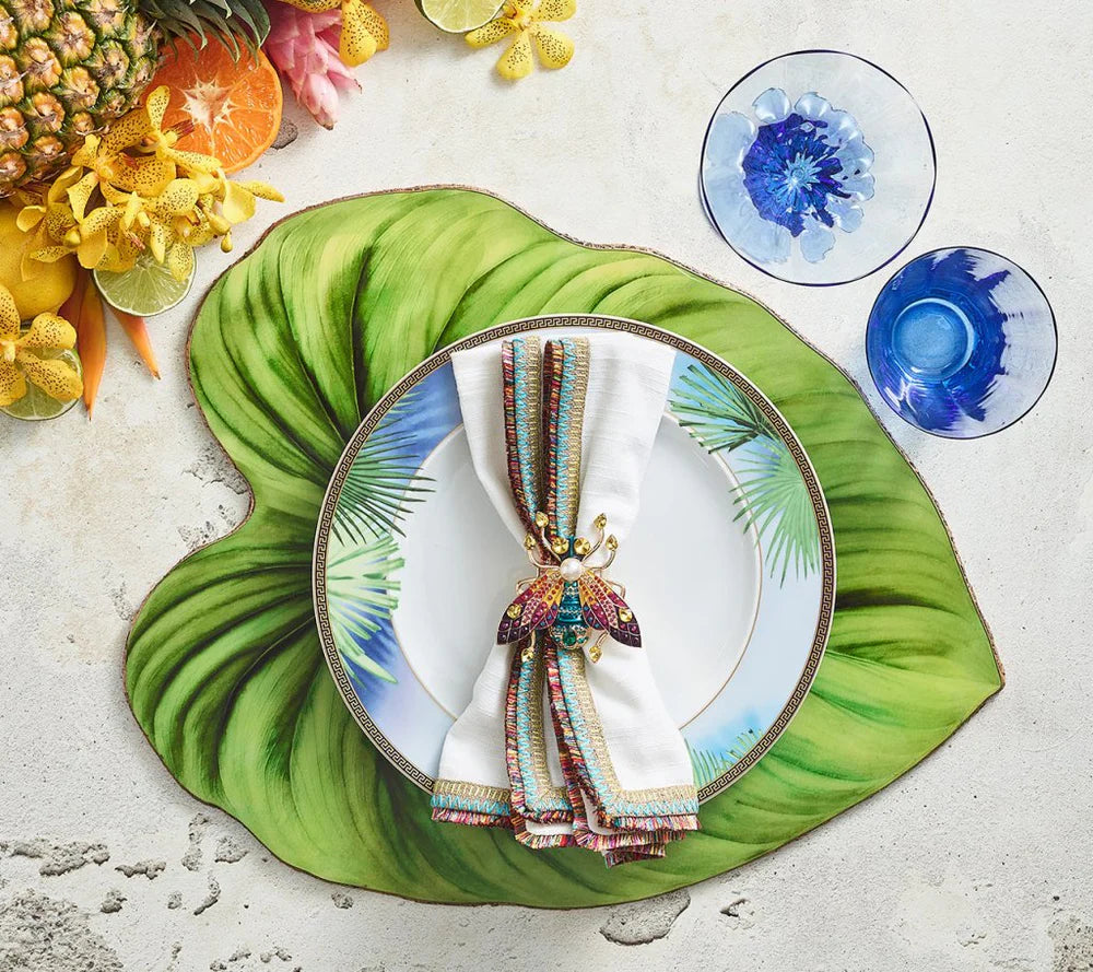 The decorative Glam Fly Napkin ring features elaborate hand-enameled details in various colors. Encrusted with rhinestones and pearls, the fantastical napkin ring depicts a mythical insect. The elaborate cast metal napkin ring is the perfect accessory for a lively soiree.