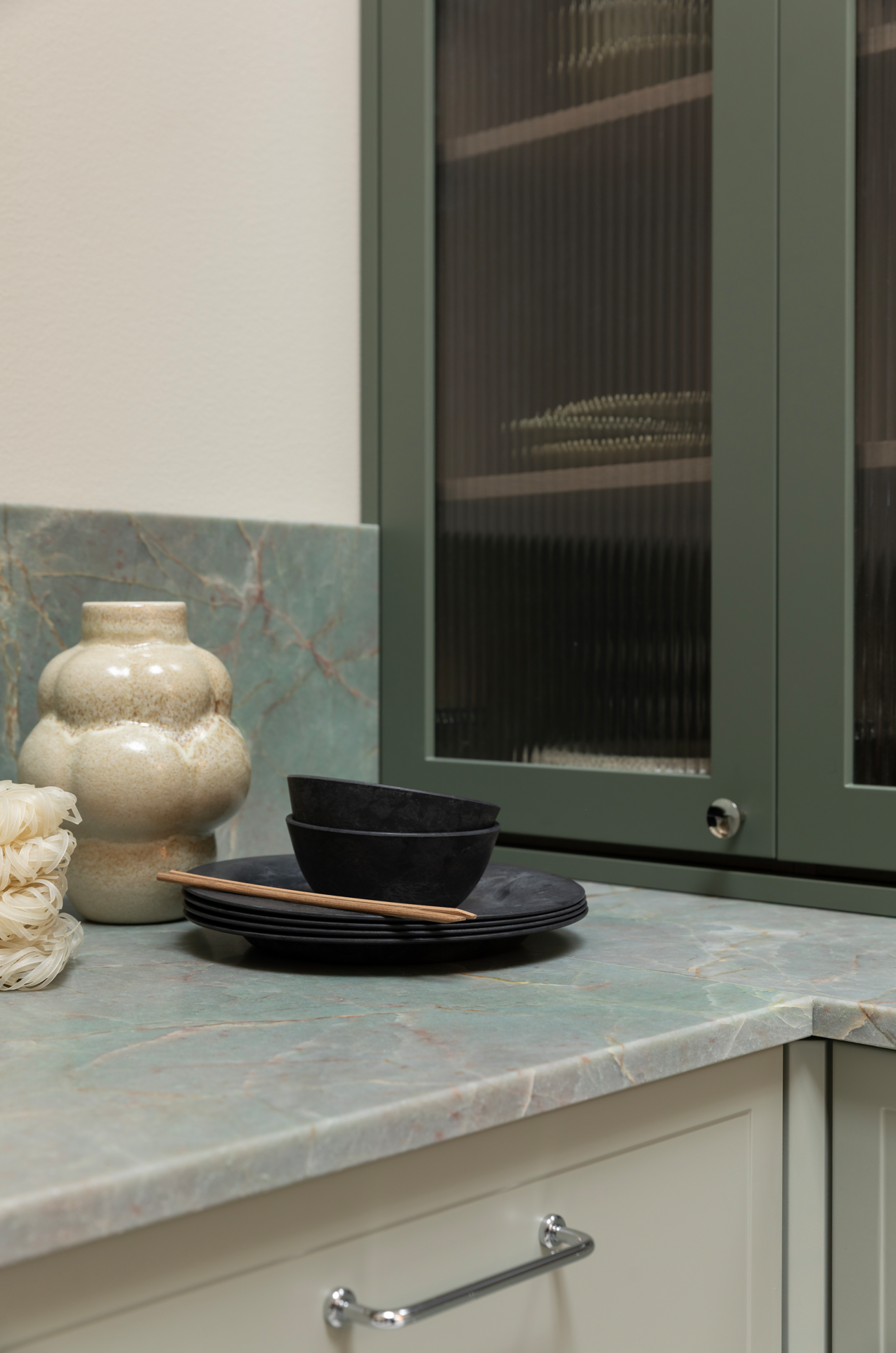 I denne modellen er det mulighet å få fine glasskap i samme utførelse som fronten. Dette kan være med på å gi et eksklusivt og fint uttrykk på kjøkkenet:
